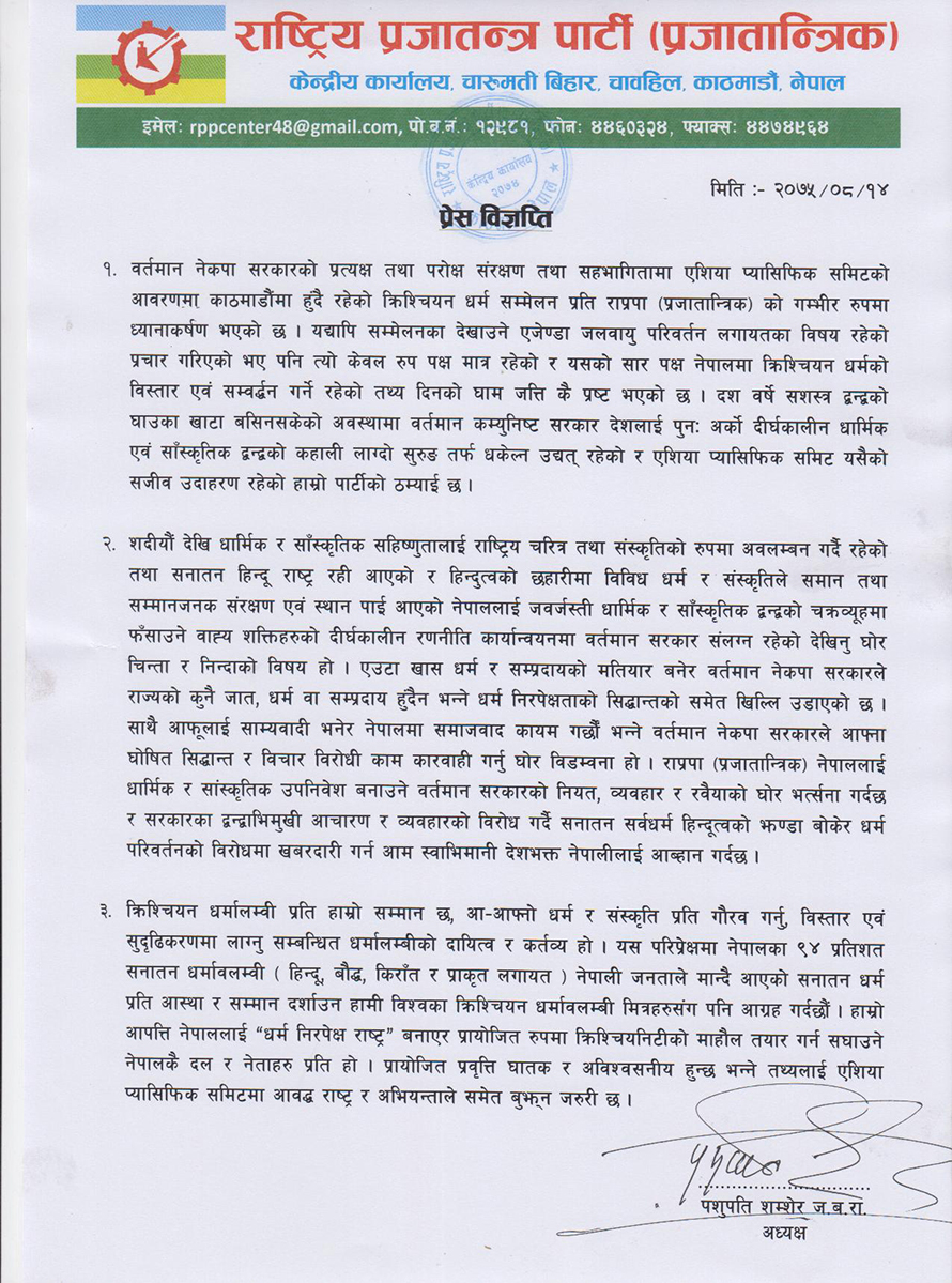‘दश वर्षे सशस्त्र द्वन्द्वको घाउका खाटा बसिनसकेको अवस्थामा वर्तमान कम्युनिष्ट सरकार देशलाई पुनः अर्को दीर्घकालीन धार्मिक एवं साँस्कृतिक द्वन्द्वको कहाली लाग्दो सुरुङ तर्फ धकेल्न उद्यत् रहेको र एशिया प्यासिफिक समिट यसैको सजीव उदाहरण रहेको हाम्रो पार्टीको ठम्याइ छ ।’ पार्टी अध्यक्ष पशुपति शमशेर जबराले प्रकाशित गरेको विज्ञप्तिमा उल्लेख छ ।