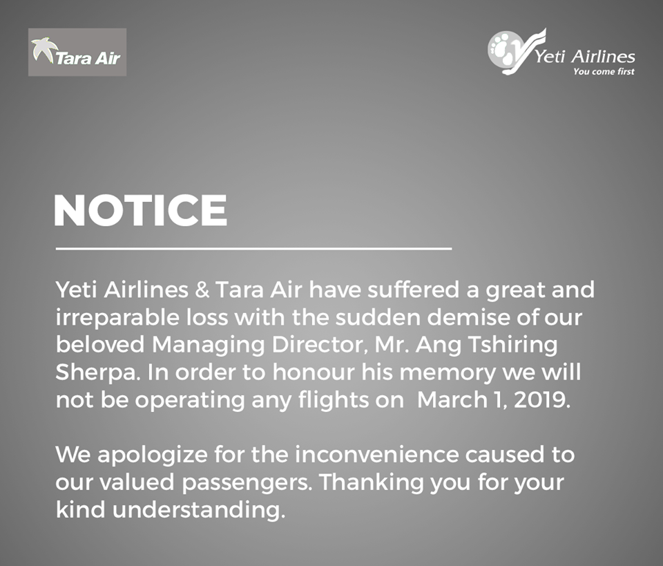 कम्पनीका प्रवन्ध निर्देशक समेत रहेका शेर्पाको निधनमा यति र उसको सहायक एयरलाइन्स ताराले आफ्ना उडान रद्द गरेको हो । सेवा स्थगित गर्दा यात्रुलाई पर्न जाने असुविधाप्रति कम्पनीले क्षमायाचना गरेको छ ।