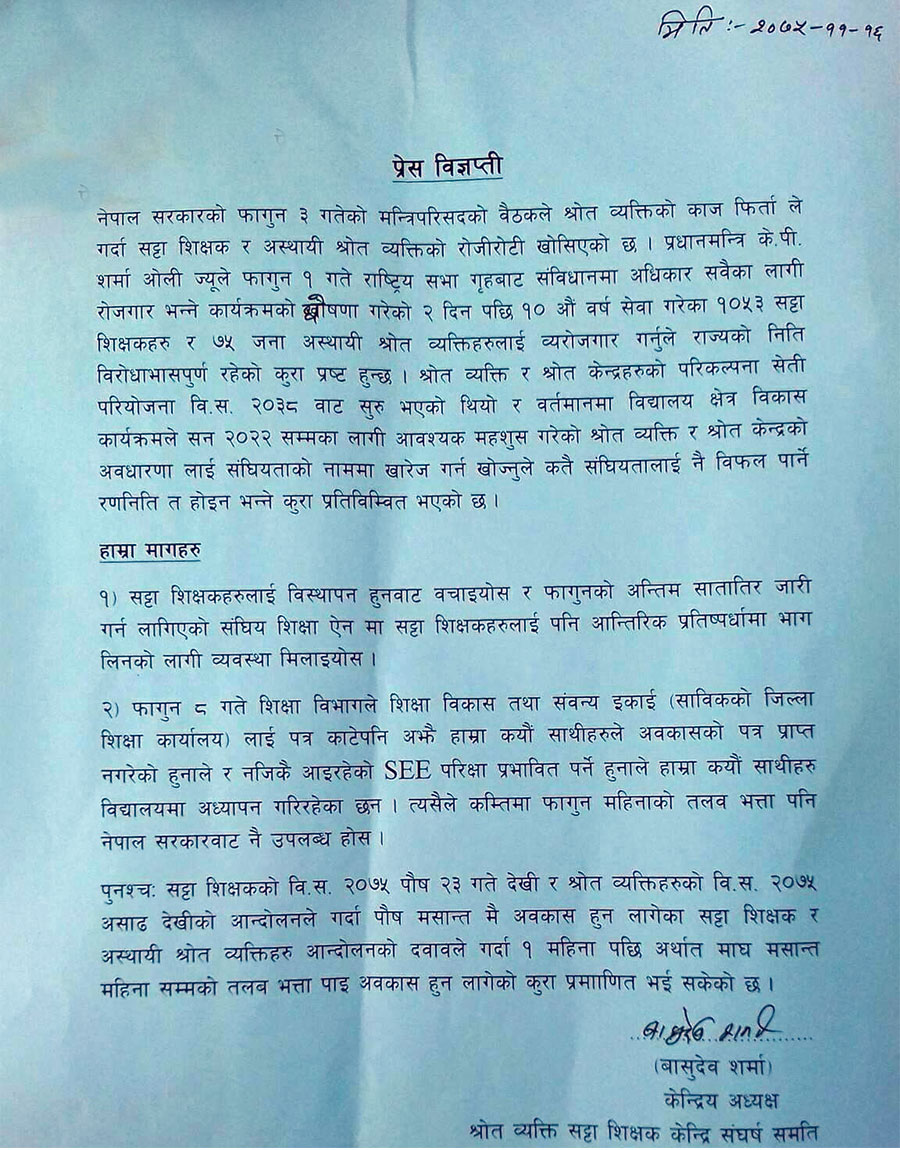 हेर्नुहोस् स्रोतव्यक्ति सट्टा शिक्षक संघर्ष समितिको विज्ञप्ति